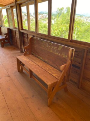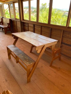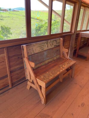 Apresentamos o Banco Mesa em Madeira de Demolição, uma peça multifuncional que une praticidade, sustentabilidade e charme rústico. Com um sistema inovador, este móvel pode ser utilizado tanto como banco com encosto quanto como mesa com bancos, adaptando-se facilmente às necessidades do seu ambiente. Produzido com madeira de demolição, valoriza o reaproveitamento de materiais e confere autenticidade à decoração.
