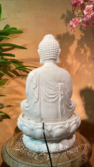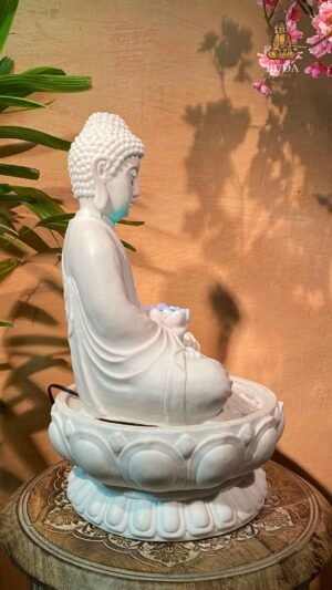 Apresentamos a Fonte Buda Lótus em Marmorite, uma peça decorativa e funcional que combina a serenidade do Buda com a harmonia da água corrente. Confeccionada em Marmorite (pó de mármore com resina), esta fonte simboliza a paz, a iluminação e o equilíbrio espiritual. A figura do Buda sentado sobre uma flor de lótus, com as mãos em posição meditativa segurando uma pequena tigela iluminada, cria um ambiente de tranquilidade e sofisticação.