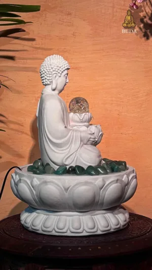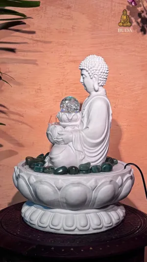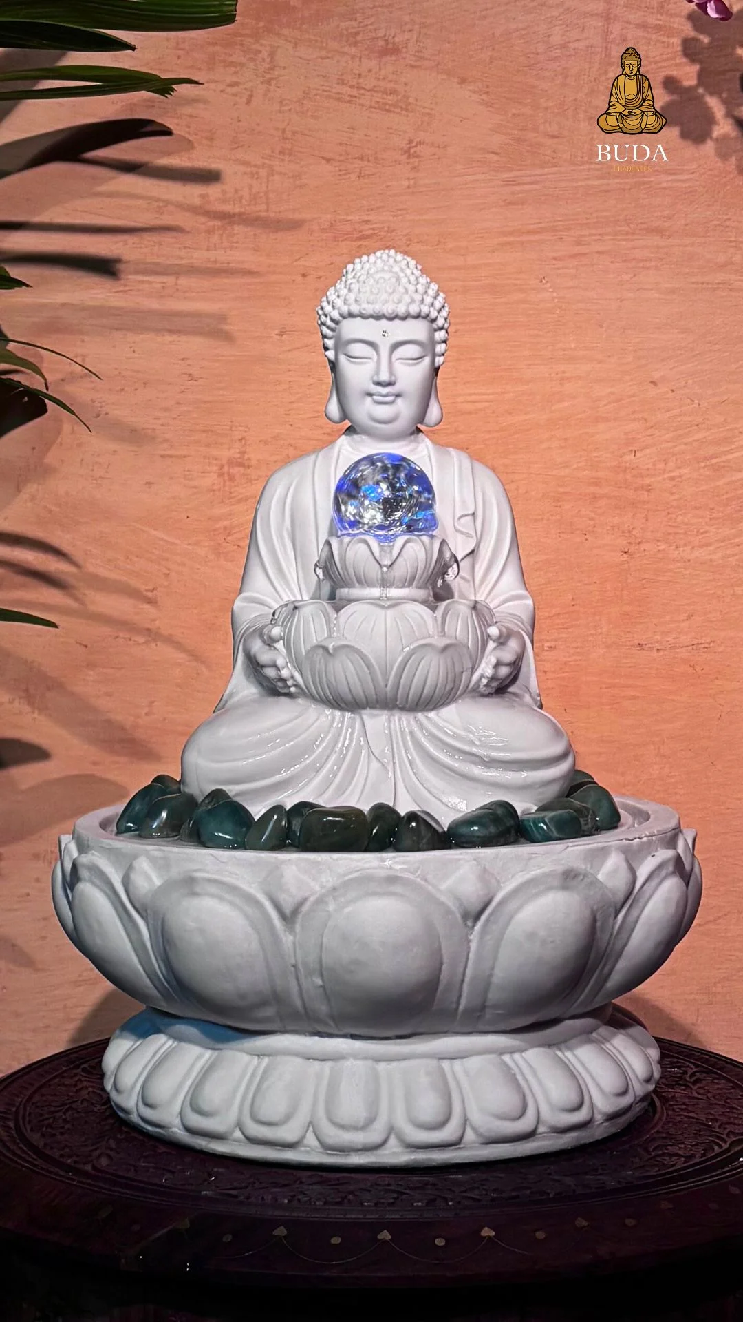 Apresentamos a Fonte Buda Lotus Zen em Marmorite, uma peça decorativa e funcional que une o som relaxante da água corrente à serenidade do Buda. Confeccionada em Marmorite (pó de mármore com resina), esta fonte simboliza paz, equilíbrio e iluminação espiritual. A figura do Buda sentado sobre uma flor de lótus, rodeado por pedras naturais, cria um ambiente de tranquilidade e sofisticação.