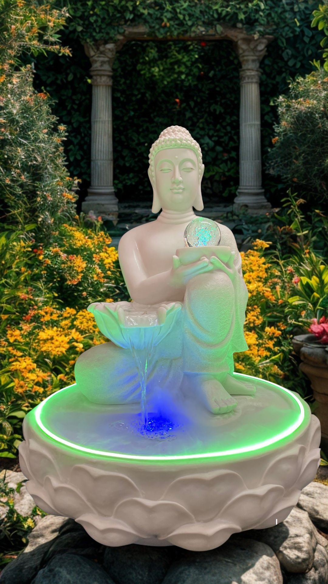 Apresentamos a Fonte da Vida em Marmorite, uma peça que une design elegante e espiritualidade. Confeccionada em marmorite, esta fonte traz a figura de Buda sentado em posição meditativa sobre uma base em flor de lótus, com água fluindo de uma esfera iluminada, criando um ambiente de paz e equilíbrio3.