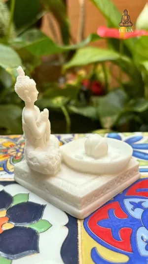 O incensário captura a essência do Buda em posição de meditação, sentado sobre uma base circular que funciona como receptáculo para as cinzas do incenso. A figura de Buda apresenta-se em posição de lótus com as mãos em mudra de meditação, representando a busca pela iluminação e paz interior. Cada detalhe foi cuidadosamente trabalhado, desde a expressão serena do rosto até as dobras do manto, transmitindo tranquilidade e equilíbrio. A base circular simboliza a completude e o ciclo eterno da existência. Esta peça multifuncional serve tanto como incensário prático quanto como objeto decorativo e espiritual, perfeita para altares, espaços de meditação, salas de yoga, consultórios terapêuticos ou como presente especial para quem busca trazer mais serenidade e consciência para seu dia a dia.