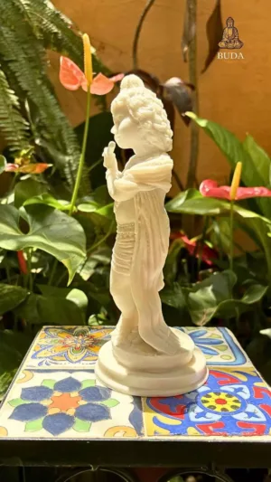 Apresentamos a escultura Krishna Menino em Marmorite, uma representação encantadora e lúdica do amado deus hindu Krishna em sua forma infantil. Confeccionada em Marmorite (pó de mármore com resina), esta escultura traz a energia da alegria, inocência e travessura divina para seu ambiente. Krishna, a oitava encarnação de Vishnu, é venerado como a personificação do amor divino, sabedoria e alegria de viver, sendo especialmente adorado por suas aventuras de infância.