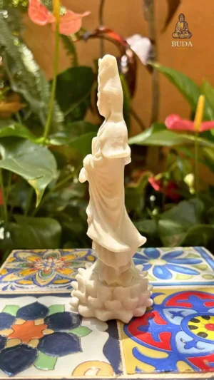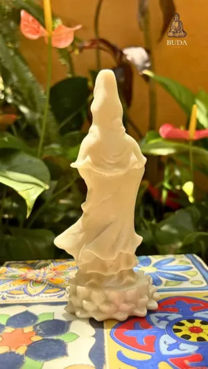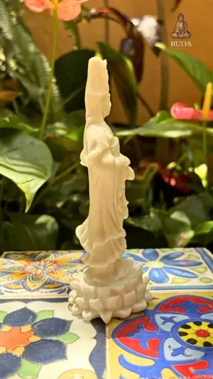 A escultura captura a essência de Kuan Yin em sua postura elegante e fluida, em pé sobre uma flor de lótus que simboliza pureza espiritual. Vestida com mantos tradicionais que caem em dobras graciosas, a deusa é retratada em uma posição que sugere movimento gentil e fluidez. Seu rosto sereno transmite paz profunda e compaixão infinita, com olhos semicerrados em meditação benevolente. A coroa ornamentada e o vaso de néctar sagrado (kalasha) que algumas representações trazem simbolizam sua capacidade de derramar bênçãos e cura sobre todos os seres. Cada detalhe foi cuidadosamente trabalhado para transmitir a elegância, graça e compaixão que caracterizam esta divindade amada. Esta peça é perfeita para altares pessoais, espaços de meditação, salas de yoga, consultórios terapêuticos ou como presente especial para quem busca mais compaixão, equilíbrio e harmonia em sua vida.