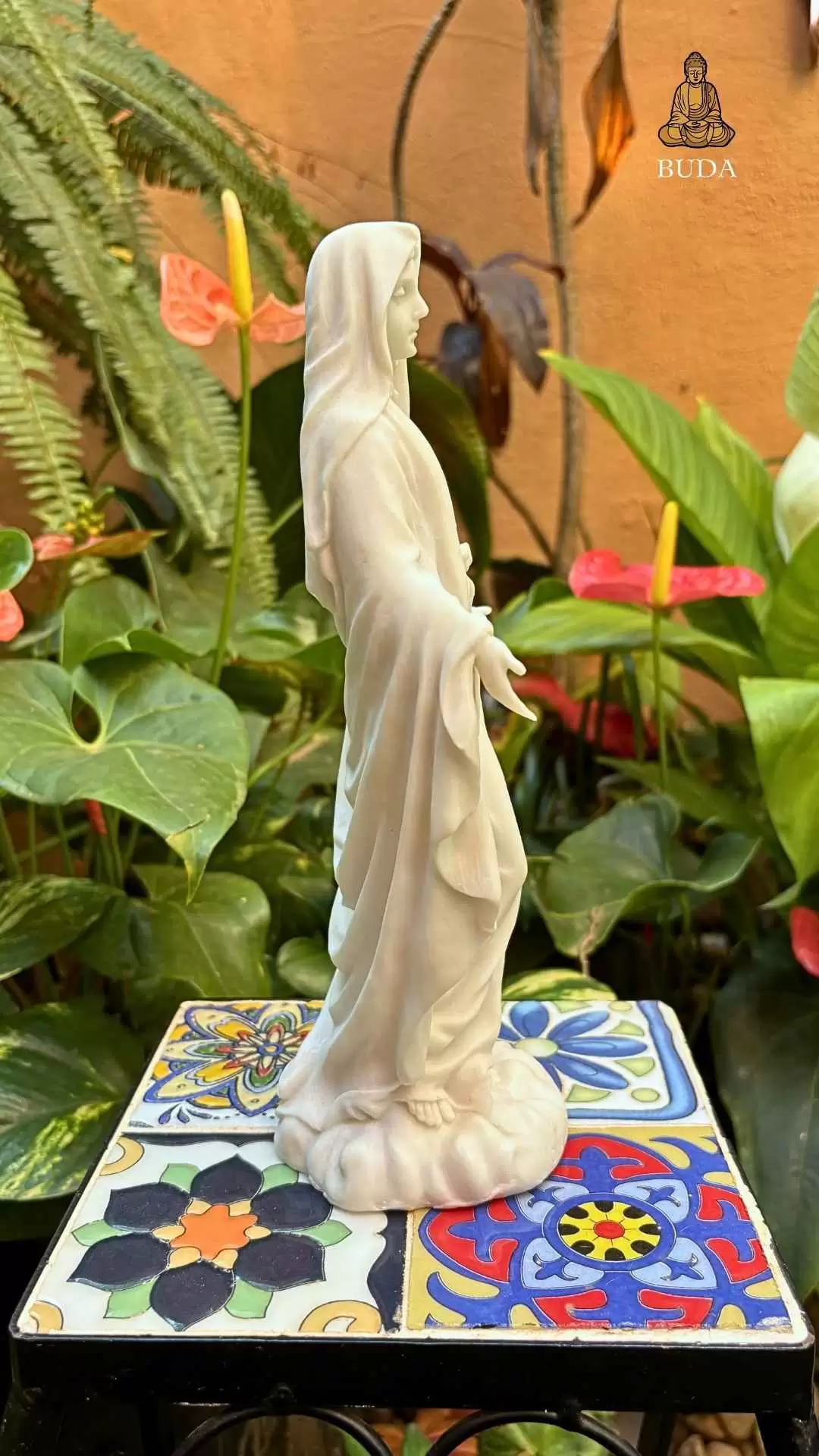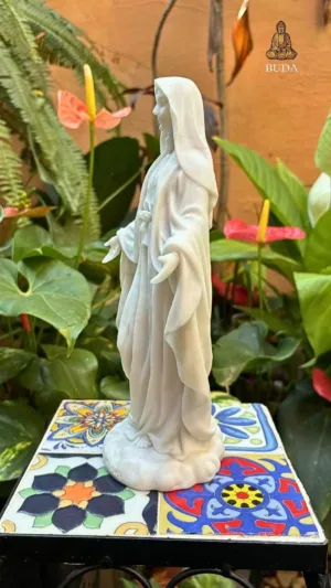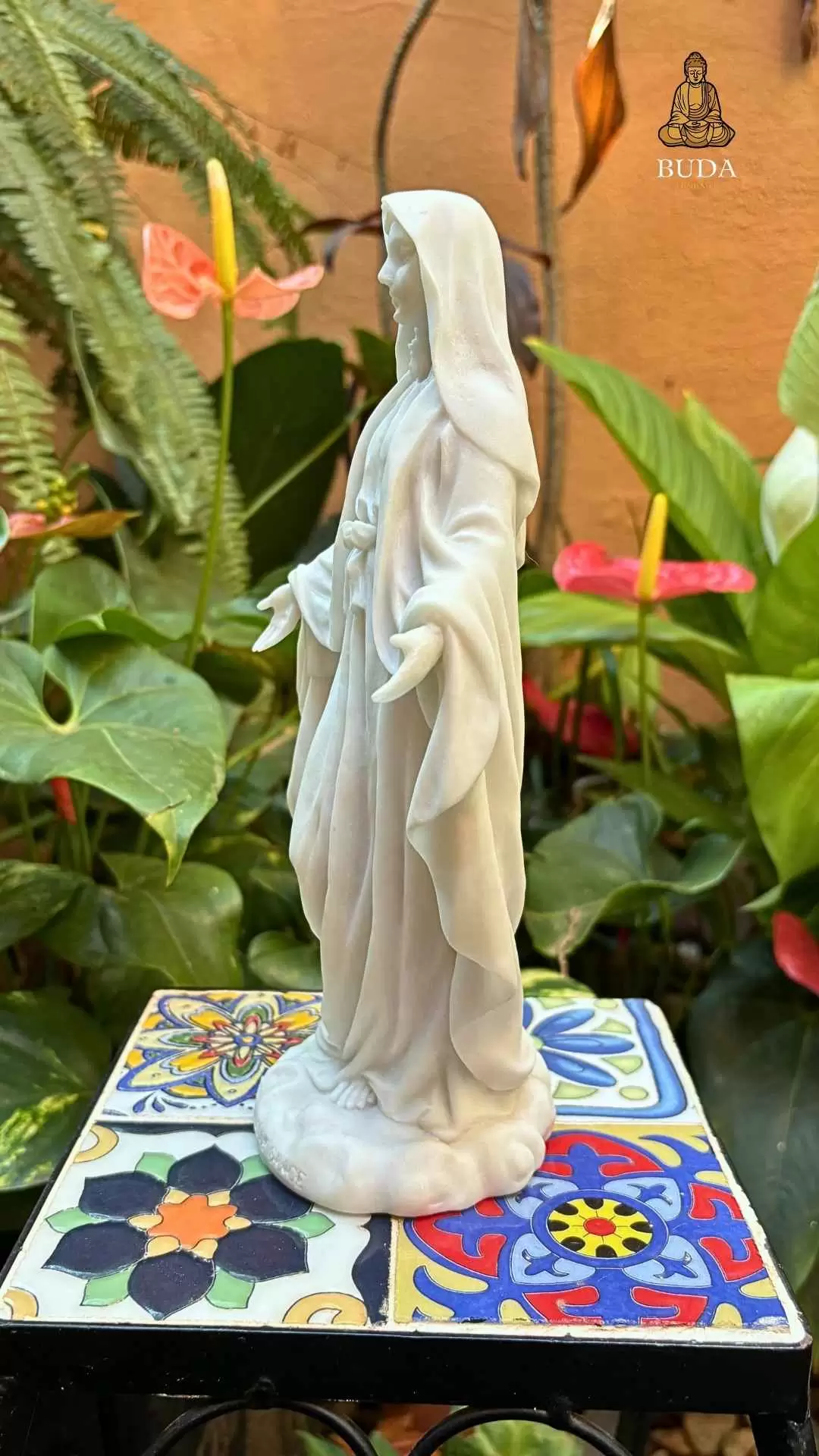 A escultura captura a essência de Nossa Senhora das Graças em sua postura tradicional, com braços abertos simbolizando acolhimento maternal e bênçãos divinas. Rica em detalhes, cada traço foi cuidadosamente esculpido para transmitir serenidade e autoridade espiritual. O acabamento refinado em marmorite branca realça os traços delicados da figura sagrada, tornando esta peça ideal para altares domésticos ou espaços devocionais. Sua presença harmoniza o ambiente com energia positiva e elevação espiritual.