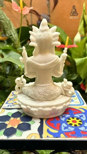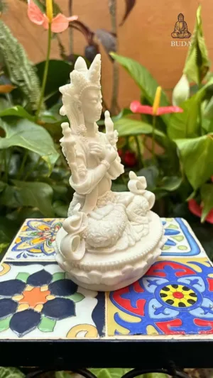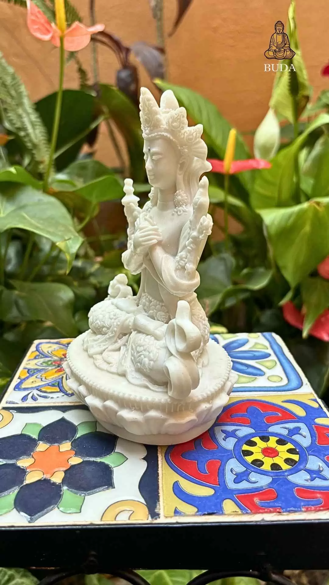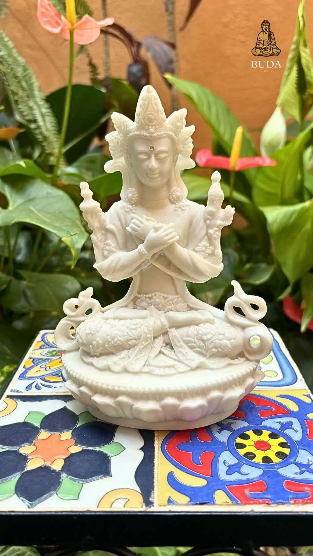 Apresentamos a Tara da Paz em Marmorite, uma representação sublime da divindade feminina budista conhecida como White Tara (Tara Branca). Confeccionada em Marmorite (pó de mármore com resina), esta escultura delicada traz a energia da compaixão, longevidade, cura e proteção para qualquer ambiente. Tara, conhecida como a “Mãe de todos os Budas”, simboliza o aspecto maternal da compaixão divina e a sabedoria transcendental que guia os seres para a iluminação.