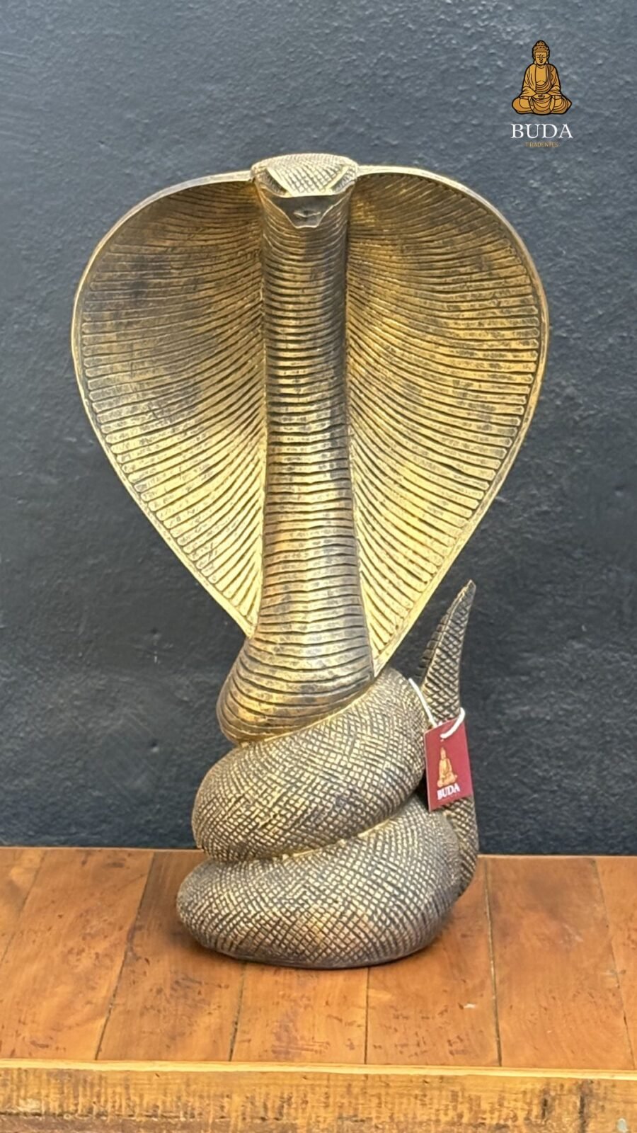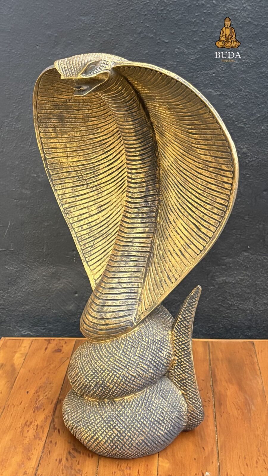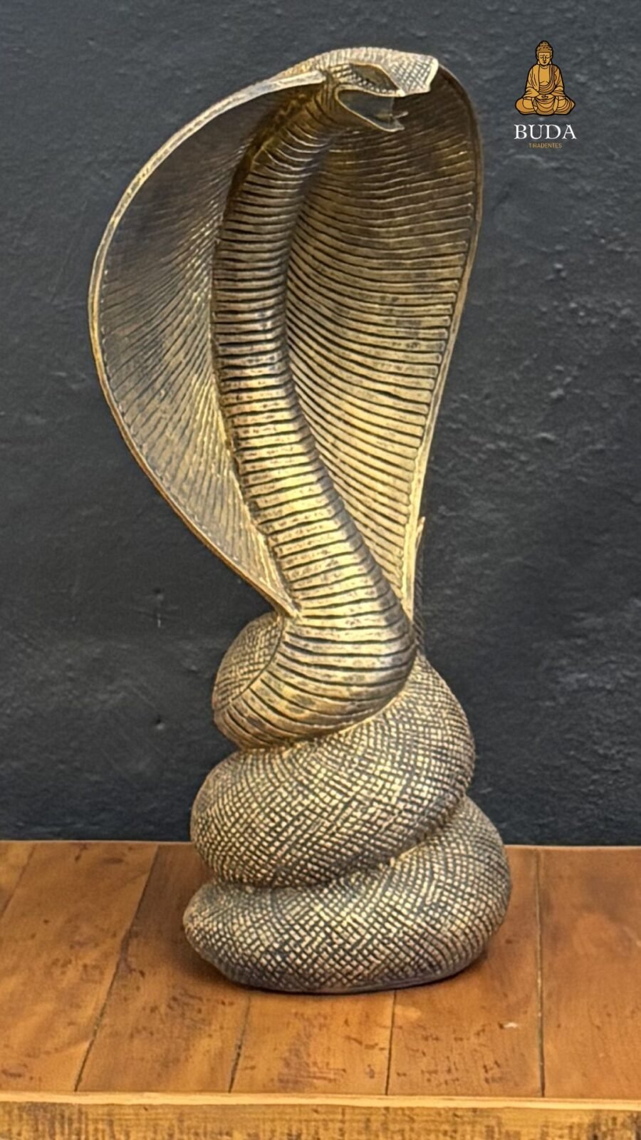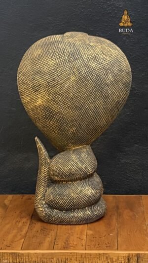 Apresentamos a Naja G, uma estátua impressionante da cobra sagrada com capelo erguido em dourado, símbolo ancestral de proteção e poder espiritual em tradições hindu e xamânicas. Esculpida artesanalmente com detalhes realistas em metal ou resina dourada, ela evoca mistério e força transformadora para decoração impactante.